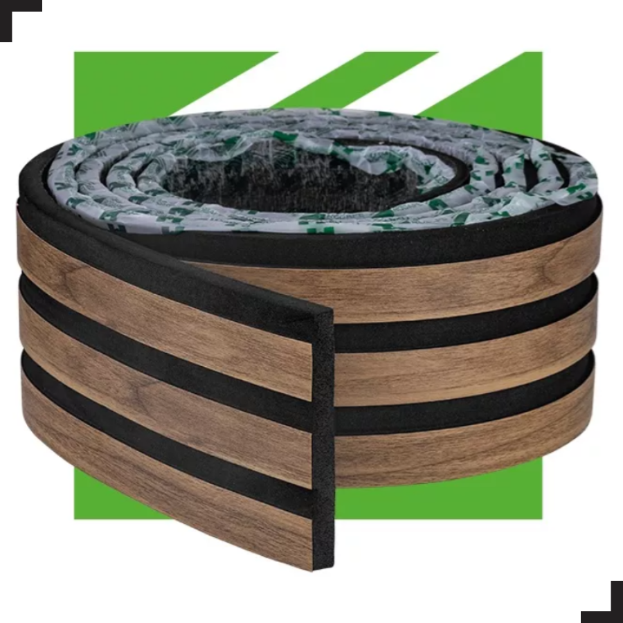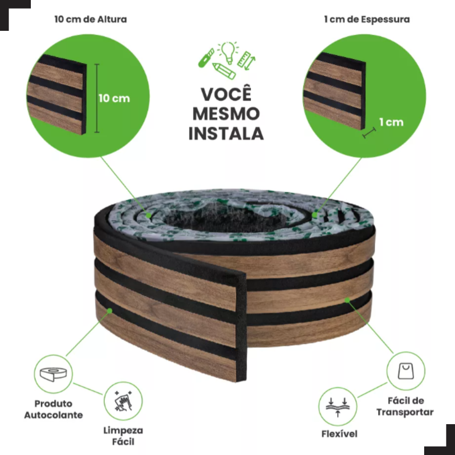 Produzido em borracha EVA, ecologicamente correto, podendo ser molhado sem correr o risco de apodrecer ou pegar cupim, autocolante com cola ultra resistênte, aceita tintas à base de água ou solvente, é flexível e se adapta facilmente a ambientes com curva.