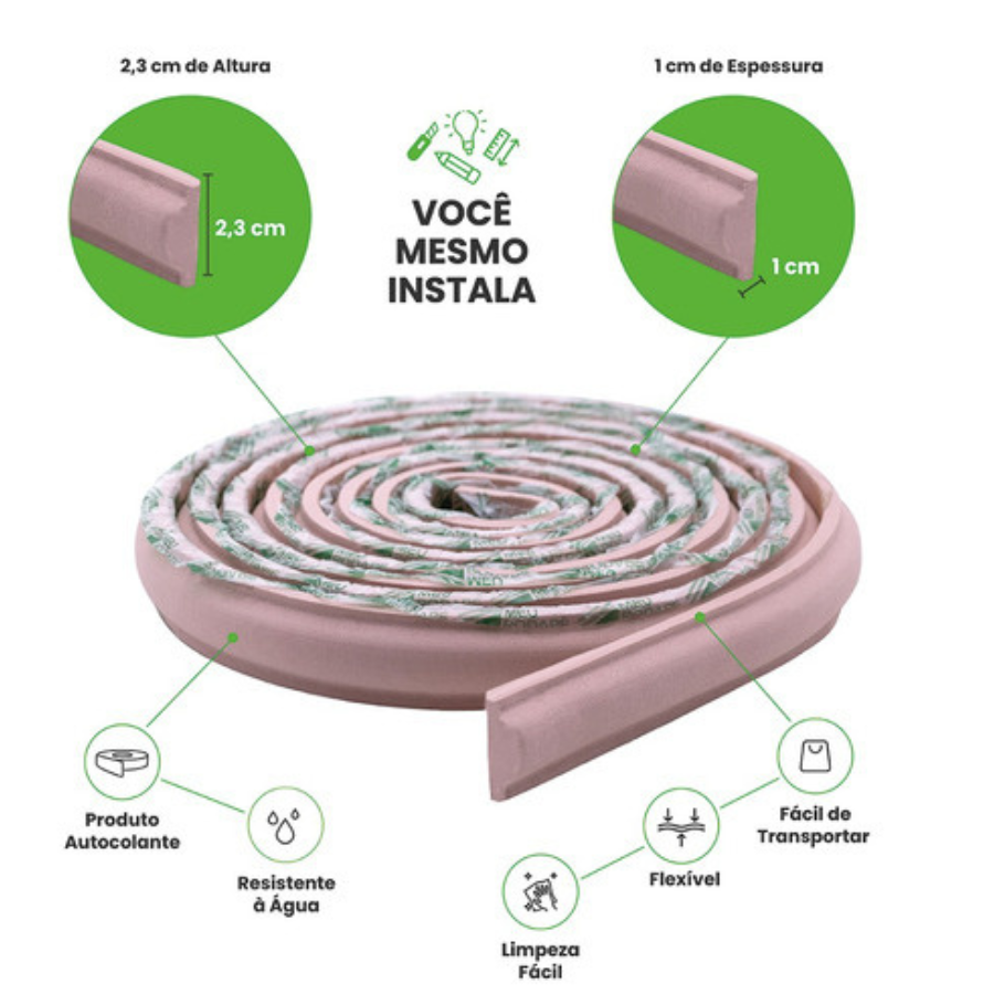 Sua flexibilidade permite aplicações em linha reta ou em curvas e arcos — basta amolecer o material com um secador de cabelo para moldar o formato desejado.