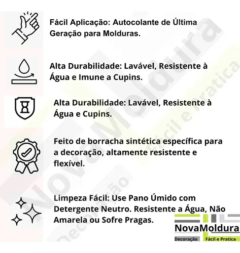 Preparação e Instalação das Molduras: Antes de iniciar a instalação das molduras, certifique-se de que o local esteja 100% limpo e livre de umidade e poeira. É fundamental garantir uma superfície limpa e preparada para uma aderência ótima. Não instale sobre cimento cru. A pintura deve estar seca e firme. Atenção: Paredes com tinta acetinada, semibrilho ou acrílica podem causar o descolamento do material. O tempo de cura total de algumas tintas ou massa corrida pode variar de 15 a 30 dias.